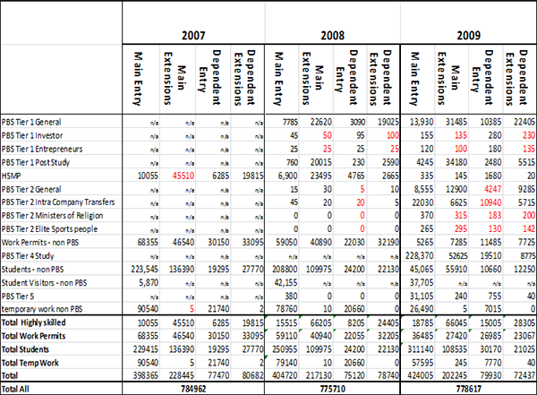 Table 1: Entry clearance visas issued between 2007 and 2009 (for each calendar year).