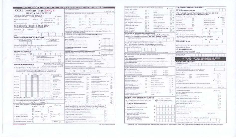 24. Data on letting is gathered by an interview with each new tenant after the home is allocated. The interview is designed to record a number of characteristics about the new tenants - one of which is nationality. The questionnaire is completed by the housing provider. The local authority will interview tenants going into local authority homes while housing associations will interview those allocated a home with a housing association. The question on nationality is optional. See Annex A – CORE Lettings log for a scanned copy of the questionnaire.