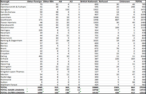 33. Tables 2 and 3 below shows the percentage of social housing lets recorded in CORE that went to foreign nationals, the percentage where nationality was unknown and the percentage recorded as going to British nationals for Inner and Outer London.