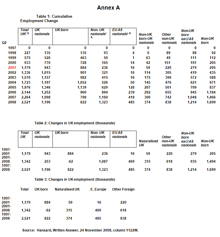 1. The proportion of British born people in work is now the same as in 2001. In effect, the extra 1.34 million jobs created in the past seven years have now virtually all gone to immigrants. A major reason for this is the arrival, since May 2004, of half a million workers from Eastern European members of the EU.