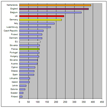 b) population density: the UK has a population density of over twice the EU average. Most immigration is concentrated on England (and London and the South-East in particular) and England has a population density of over 3 times the EU average and second only to the Netherlands and Malta in the 25 nation EU. Appendix 1 shows the population densities of the EU states. Congestion is therefore a much more significant factor in the UK than elsewhere and points to a very clear need for the UK to be able to limit immigration by controlling its own borders and having its own immigration policy.