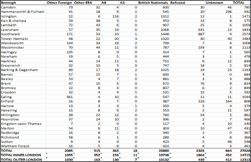 32. Much greater variation appears when the data is examined at borough level (see Annex B) where there are large differences both in the numbers recorded as going to foreign nationals and in those who refused to answer.